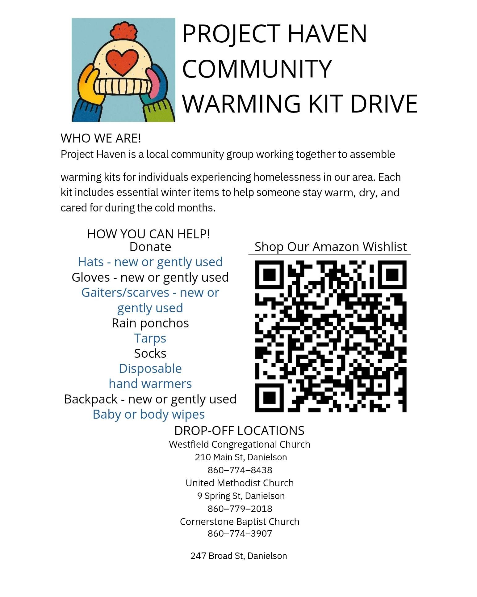 Space in the warming shelters are often limited and more of our neighbors are finding themselves losing access to a stable roof over their heads and the need for basic items continues to grow. If you have a little extra to share in this way, check out the list. Our church is a collection site for items and will also be a place people can get a kit once they are assembled.
